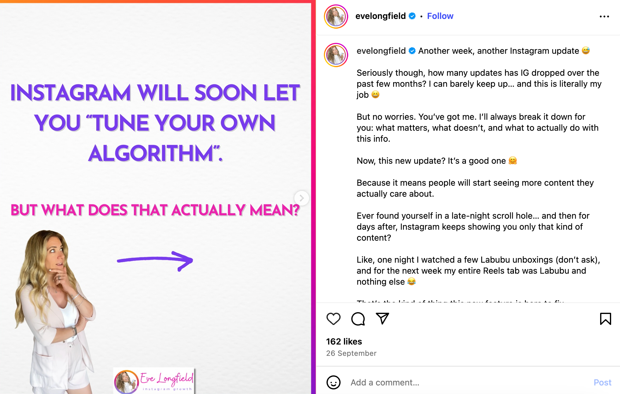 For example, Instagram strategist @evelongfield creates educational carousels explaining algorithm updates. Her post about Instagram's "tune your own algorithm" feature uses bold text and relatable examples, making it both save-worthy (reference information) and share-worthy (helps followers understand platform changes).