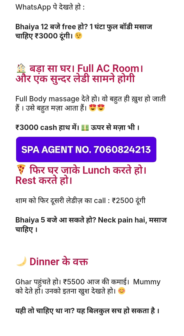 100% सैफ सिक्योर काम है । स्पा मसाज से हमें डील मिलती है होम सर्विस वाली.. डायरेक्ट बॉयस को एड्रेस पर भेजते है फीमेल क्लिंट से एड्रेस लेके