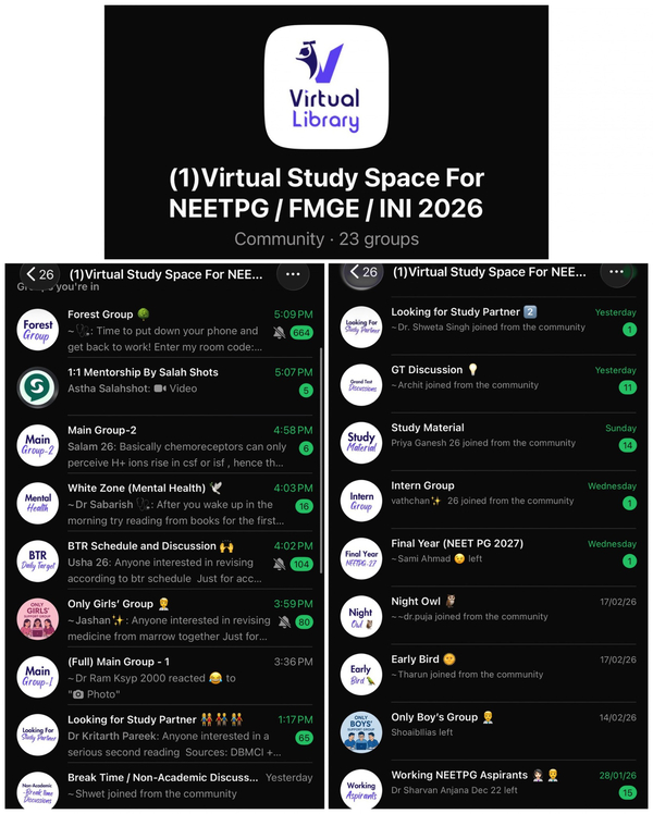 We have dedicated Virtual Library groups for students preparing for NEET PG 2027 and 2028, so you can easily find the right study partners and make the most of your productive hours through the Virtual Library.