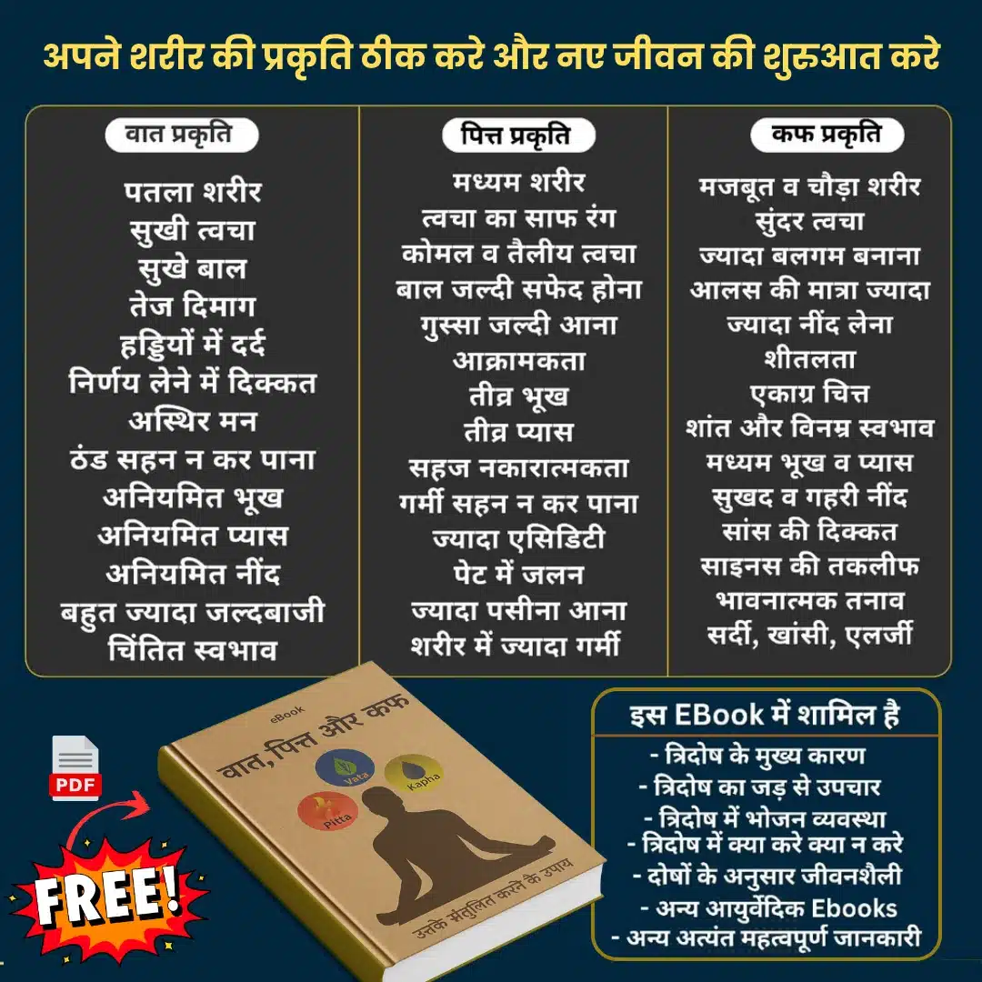 यह विशेष Ebook आपको बताएगी कि शरीर में वात, पित्त और कफ के असंतुलन को कैसे पहचाने और आयुर्वेदिक उपायों से उसे संतुलित करें। इस Ebook की कीमत ₹299 है, लेकिन यह आपको इस बंडल में बिल्कुल मुफ्त मिल रही है।