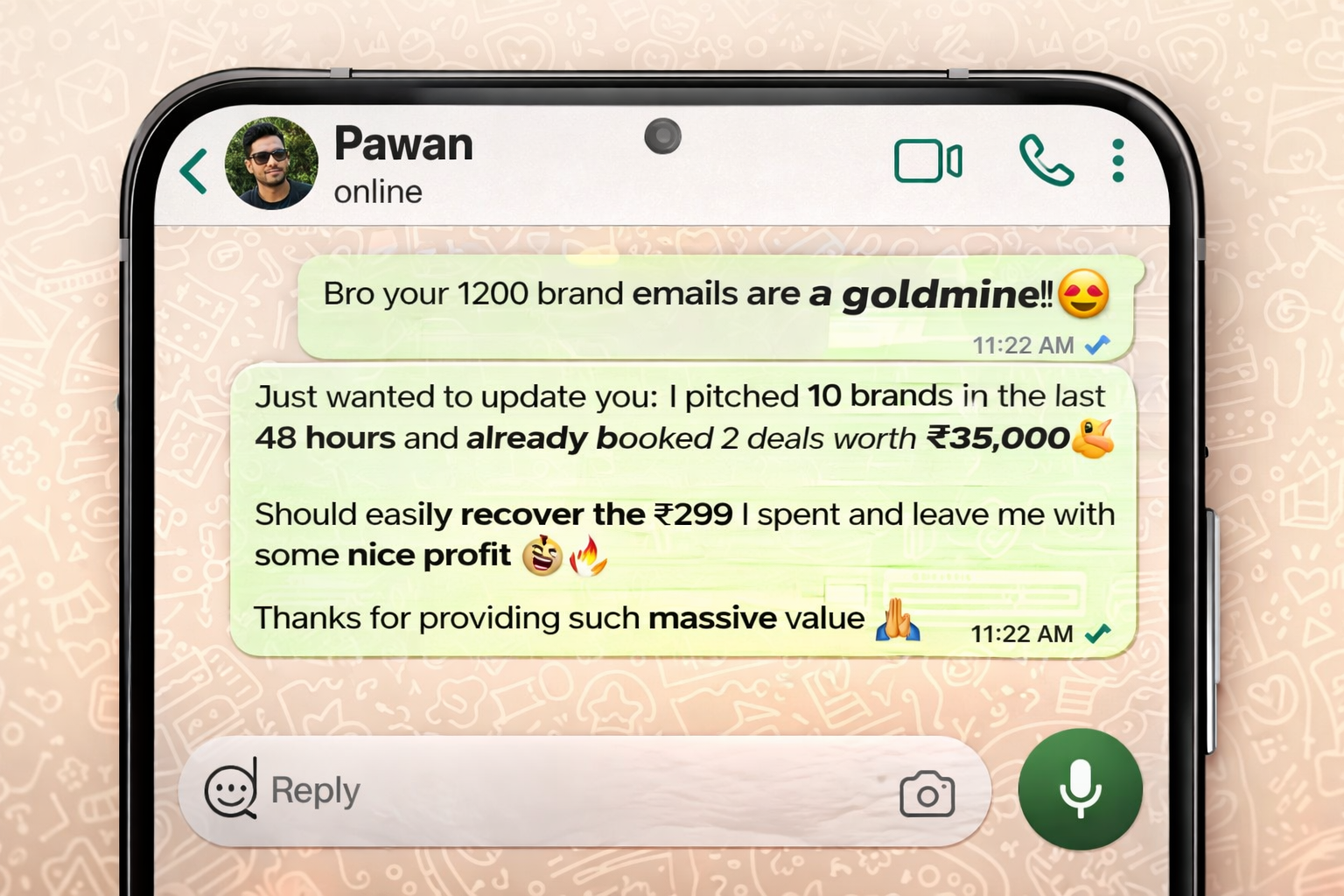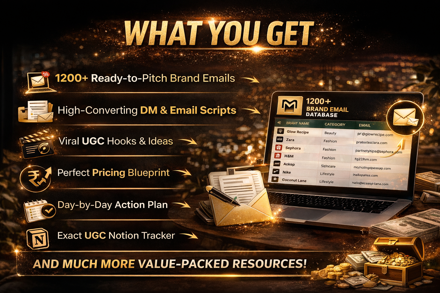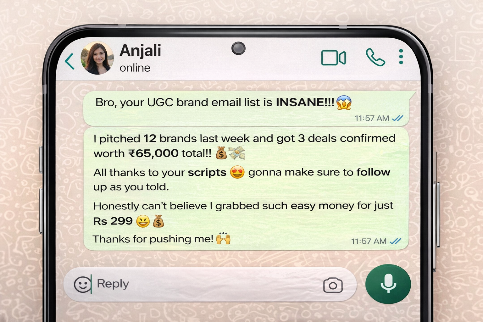 A complete UGC system + 1200+ brand contacts so you can land ₹30K–₹80K deals faster.